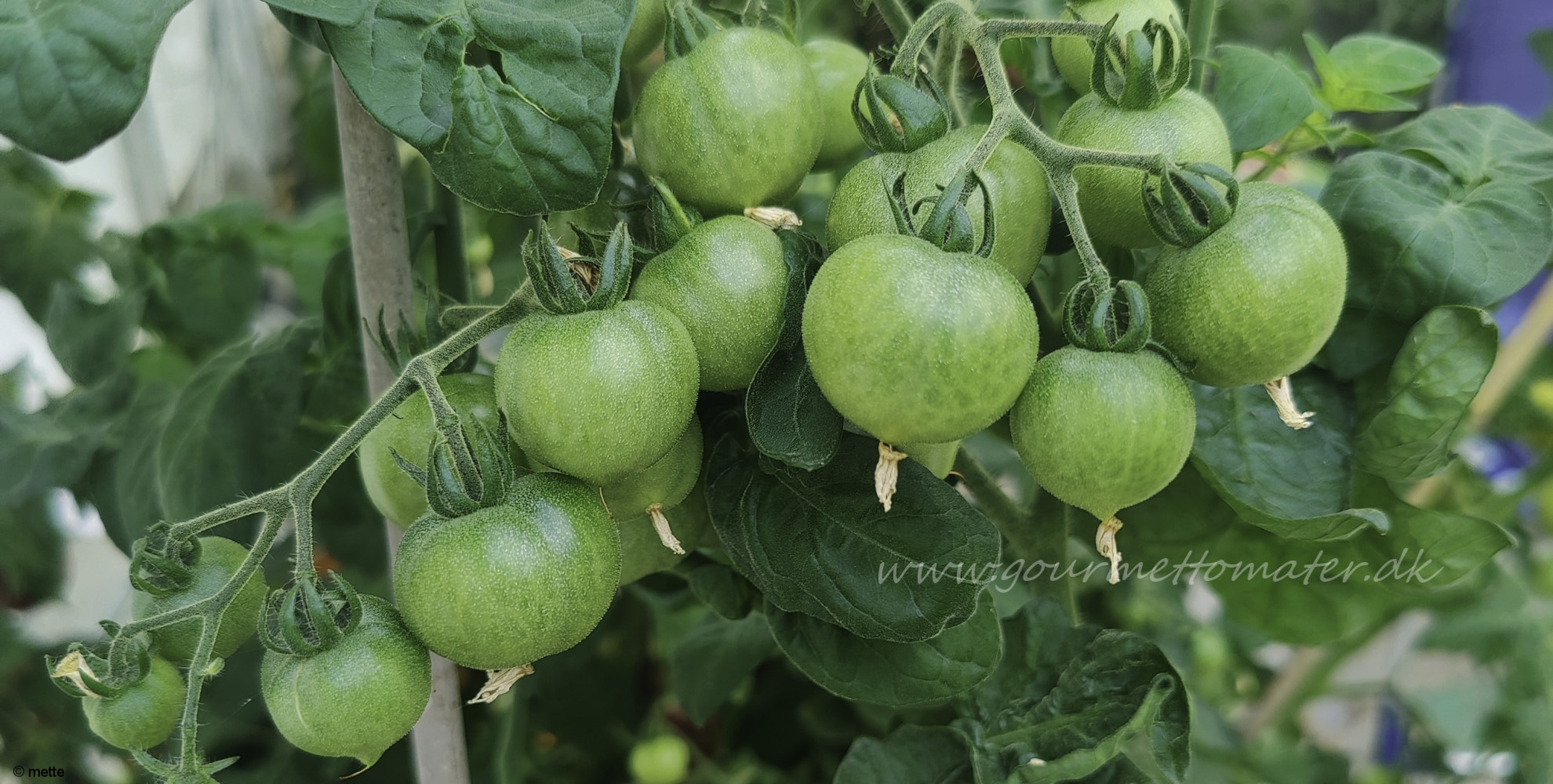 Sweet Baby Jade sætter kolosalt mange tomater. Klaserne er store og tomaterne hænger ganske tæt. Tomaterne er små, lidt fladtrykte cherry-størrelse. Tomaterne, som er Green-When-Ripe, er modne når de farven skifter til gullig/oliven i kuløren. Smagen af disse tomater beskrives som krydret og sødmefyldt, men det var ikke tilfældet for dem jeg dyrkede i 2023. Jeg var ikke imponeret over smagen. Den manglende i den grad sødme, det kunne skyldes måske den meget kølinge juli måned.