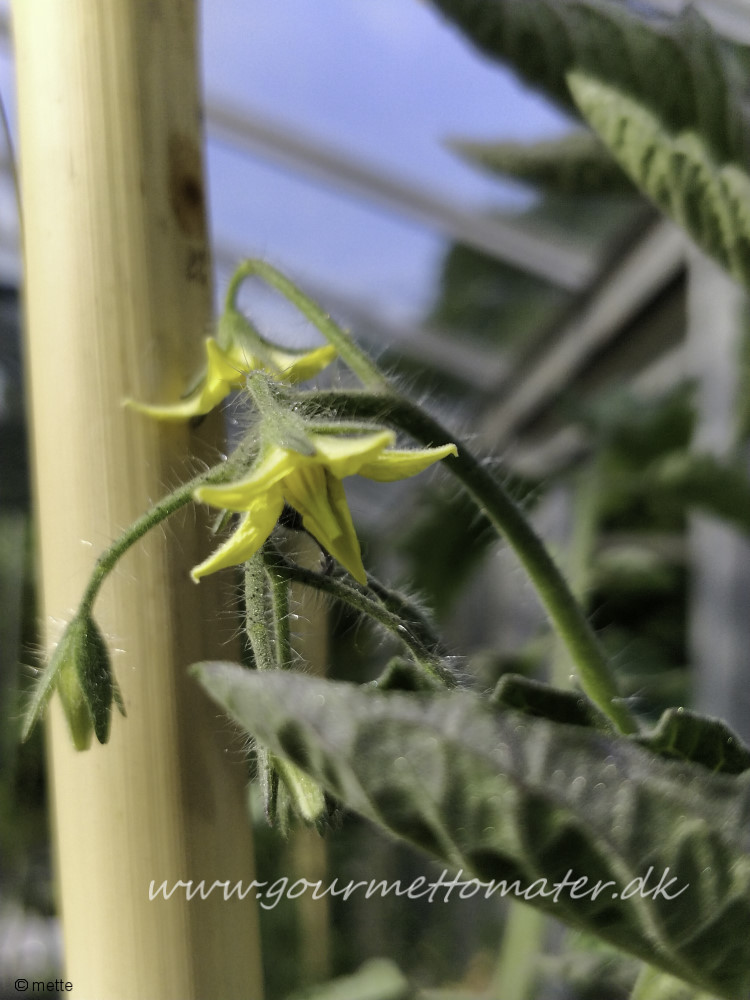 Tomaterne er fra et tidligt stadie i deres udvikling meget specielle at se på, idet de er lysgrønne med et lysrødt/lilla skær og med lilla skuldre og ser faktisk modne ud, men det er de ikke (smagte på dem).